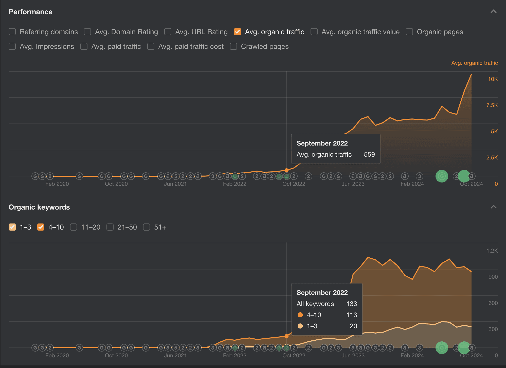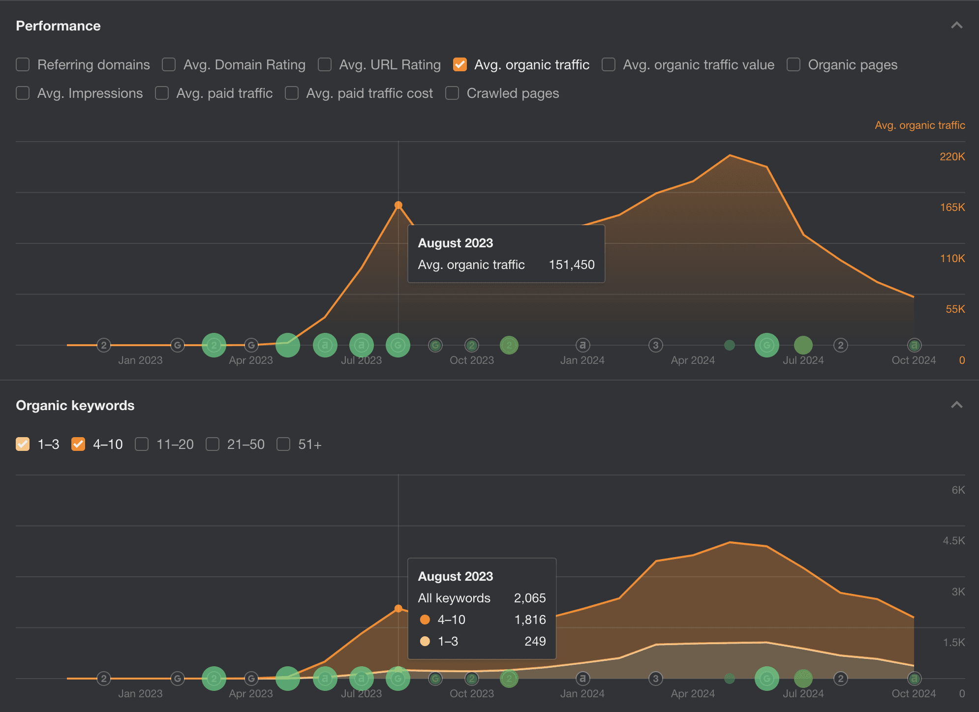 In May 2023, we focused on volume for TopApps.ai and the results speak for themselves, from absolute zero to just over 150,000 Avg. organic traffic. In August 2023, TopApps moved on from BlogJoy but then came back to us to reignite that growth we had created for them initially.